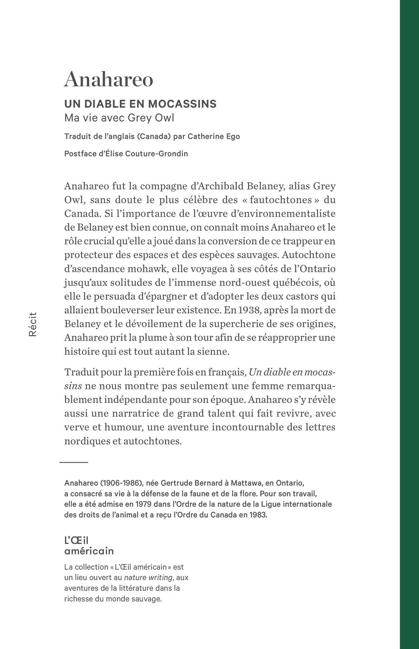 En 1938, après la mort de Belaney et le dévoilement public de la supercherie de ses origines, Anahareo prit la plume à son tour, afin de se réapproprier une histoire qui est aussi la sienne. Les épisodes qui figurent dans ce livre, telle la fascinante incursion d’une Mohawk de vingt ans accompagnée de son louveteau apprivoisé dans les rues boueuses et bordées de cabanes d’une ville-champignon appelée Rouyn, ou encore son escapade au pays des prospecteurs, où elle passera tout un hiver à guider des traîneaux à chiens au cœur de l’océan de neige qui s’étend entre Oskélanéo et Chibougamau, sont ici racontés en français pour la première fois.