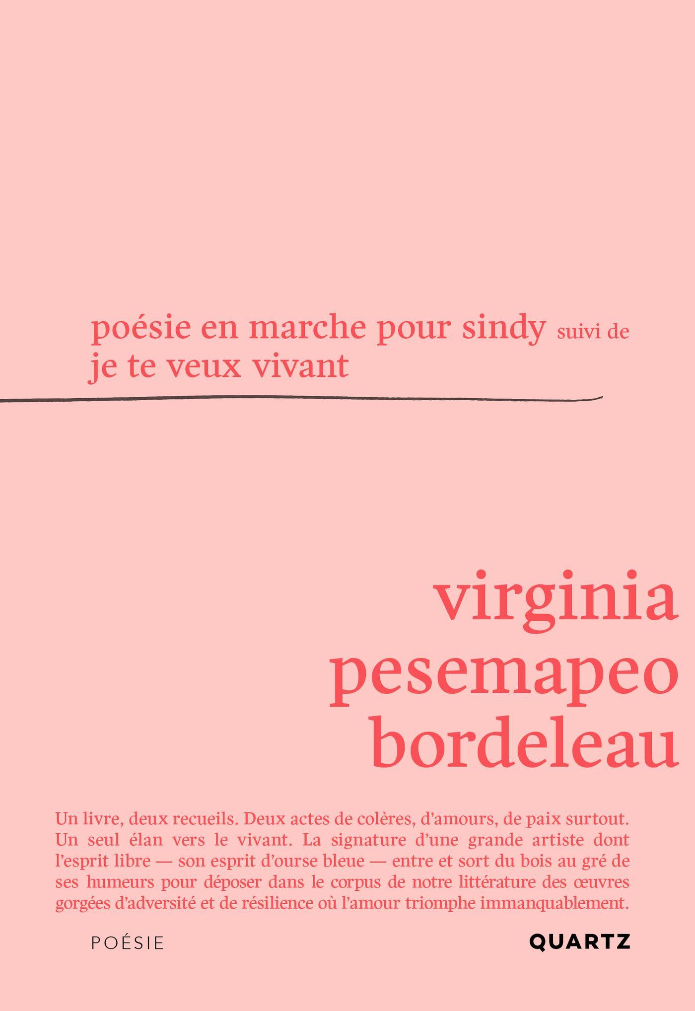 Selon Dominic Tardif, « Poésie en marche pour Sindy » est "l’un des grands recueils publiés au Québec ces dernières années", un recueil puissant écrit à la suite de la disparition au printemps 2014 de Sindy Ruperthouse, femme de la Première Nation Abitibiwinni de Pikogan. Avec «Je te veux vivant », l’artiste juxtapose la poésie aux thèmes de la maternité et du deuil avec une déchirante honnêteté, adressant d’une part a poésie à son fils décédé, et d’autre part à son mari d’alors aux prises avec la maladie. Deux actes de colère, d’amour, de paix – surtout – qui se trouvent rassemblés dans un nouvel écrin, un design épuré qui s'inscrit dans le mouvement, mais aussi en dehors du bruit, laissant toute la place au texte. La préface est signée par Vanessa Bell, directrice de la collection Poésie du Quartz, qui défend l’œuvre de Virginia depuis de nombreuses années.